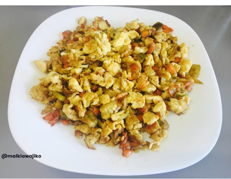 Mara tu ukiweka mayai kwenye frying pan pale pale anza kuya vuruga vuruga na mwiko huku unahakikisha kila kitu kinachanganyika Vizuri, hadi utakapoona mayai yameiva na kubadilika rangi kuwa ya njano, zima jiko na yatoe weka kwenye sahani kwa kuliwa.