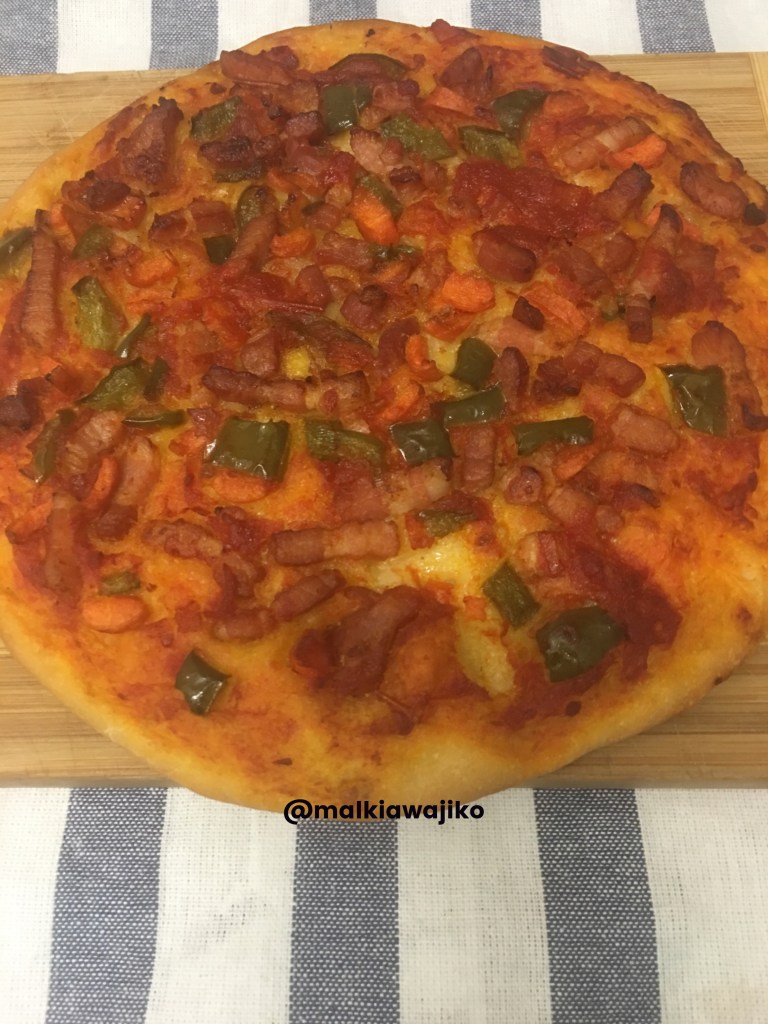 Halafu nikaweka kwenye chapati ya pizza tomato paste kiasi, Kisha nikaweka nyama, na hoho na karoti, Kisha nikaoka kwenye oven (450F) km dk 15. #karibu